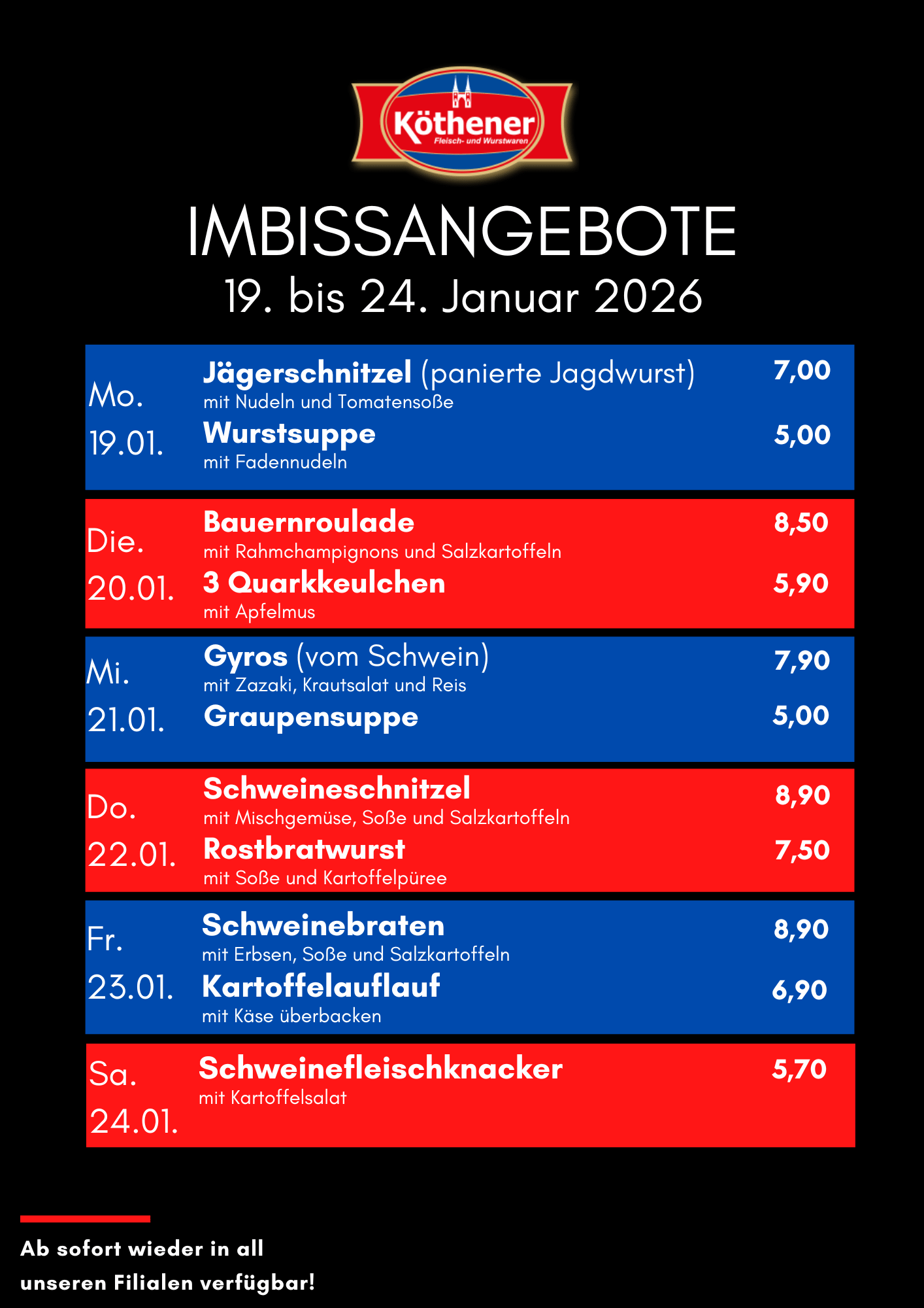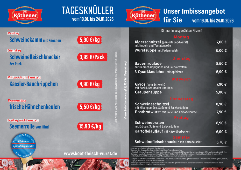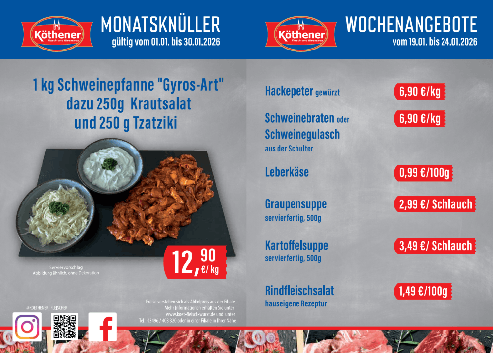 Fleischpaket, Grillpaket, Kalbsschnitzelfleisch, Kalbshinterhaxe, Lammkeule, Kaninchenkeulen, Kaninchenleber, Hirschroulade, Wildschweinroulade, Rostbratwurst, Grillschnecken, Rostbratwurst, Köthener Rostbratwurst, Köthener Röster, Köthener Weißwurst, Bockwurst, Bockwurst mit Majoran, Knoblauchbrühwurst, Krakauer, Wiener, Chiliwiener, Käse-Wiener, Partywiener, Zungenrotwurst, Hausmacher Rotwurst, Semmelblutwurst, Leberwurst, Hausmacher Leberwurst, Leberwurst mit Kalbfleisch, Sahneleberwurst, Kasslerleberwurst, Zwiebelleberwurst, Zwiebelleberwurst geräuchert, Presskopf, Sülzfleisch, Schinkensülze, Schweinskopfsülze, Bauernsülze, Gurkensülze, Kraftfleisch, Gekochtes Mett, Brühknacker, Rauchpeitschen, Vesperwürstchen, Rinder-Knacker, Köthener Stifte, Knackwurst, Schlackwurst , Schmalz eigene Herstellung, Kräuterschmalz, Räucherspeck, Sülzkotelett, Schinkenröllchen, Bauchspeck, Steinauer Bergbraten, Bauchwellfleisch, Schinkenstücke, Schweinezunge, Rinderzunge, Kasslerhähnchenschenkel, Bouletten, Schnitzel, Wurstsuppe, Räucherlende, Kinderpastete, Hähnchenpastete, Putenbrustroulade, Hähnchenpastete, Lütticher Leberpastete, Kaisersülze, Zwiebelfleisch-Sülze, Kümmelsülze, Knabber-Kabanos, Rügenw.Teewurst, Pommersche Leberwurst, Edelsalami, Eichsfelder Stracke, Rinder-Fleischsalami, Mailänder Salami, Chicken Salami Napoli, Ungarische Salami, Frühlingssalami, Gänsegriebenschmalz, Hubertusschmalz, Frischkäse-Pastete, Gemüsemix, Hähnchenbrustfilet, Hähnchenfleisch, Mixgemüse in Aspik, Schinkenröllchen, Serrano Schinken, American Roastbraten, Kümmelbraten, Putenbrust/ Paprika, Truthahn-Spargelschinken, Kamm gefüllt mit Gemüse, Reinbeker Brtaenfleisch, Soljanka, Kartoffelsuppe, Linsensuppe, Grüne Bohnensuppe, Erbsensuppe, Graupensuppe, Möhrensuppe, Gulaschsuppe, Felcke, Nierenragout, Gefülgelfrikassee, Würzfleisch, Sauerkraut, Rotkohl, Grünkohl, Bratklops, Knacker mit Grünkohl, Speckkartoffelsalat, Weißkrautsalat, Rotkohlsalat, Zigeunersalat, Geflügelsalat, Schichtsalat/Frühlingssalat, Pilzsalat, Bunter Hirtensalat, Tzaziki, Fleischsalat, Wurstsalat, Rindfleischsalat, Kasslersalat, Käsesalat, Kassler-Zwiebelfleisch, Nudelsalat, Jägerschnitzel, Geflügelsalat, Wurstsalat, Frischkäsepastete